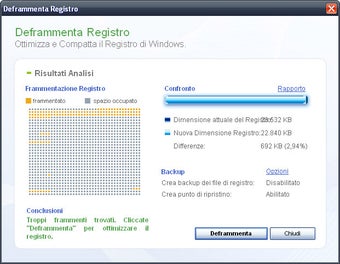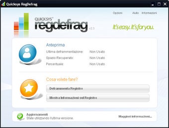 Quicksys RegDefrag è in italiano e offre un'interfaccia estremamente amichevole. Ogni operazione è guidata passo a passo e ogni funzione è spiegata nei minimi dettagli. L'analisi previa consente di mostrare il livello di frammentazione del registro e la percentuale di ottimizzazione possibile.